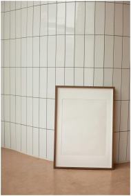 A minimalist interior featuring a blank vertical frame against tiled wall, offering ample copy space.