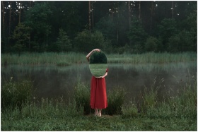 Artistic photo of a woman in nature holding a mirror beside a misty pond.