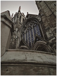 A majestic view of gothic architectural detail, showcasing intricate windows and stonework.