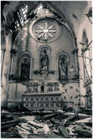 Captivating view of an abandoned church altar with religious statues and dilapidated surroundings.