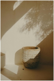 An artistic capture of a ceramic pot adorned with Moroccan patterns in natural sunlight.