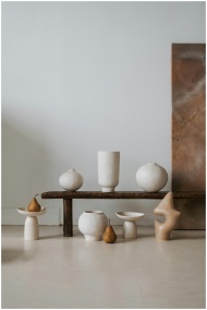 Artistic display of ceramic vases and a wooden ben