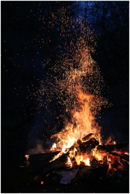 A blazing campfire illuminates the night, with sparks flying in the dark forest atmosphere.
