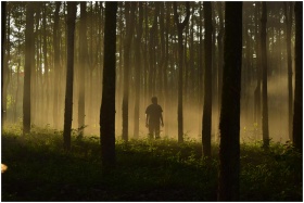 A man stands silhouetted amidst mist in a dense autumn forest, backlit by the rising sun.