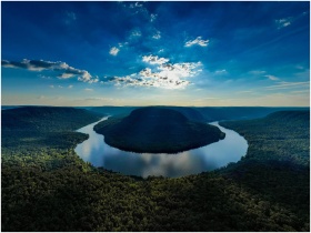 Stunning aerial view of a river curving through a lush forested valley under a vibrant sky.