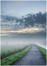 A serene misty country road in Stekene, Belgium at dawn, offering a peaceful rural landscape view.