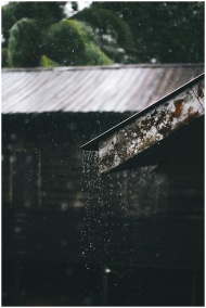 Glistening rain falls from a rusty metal roof, creating a moody, atmospheric scene.