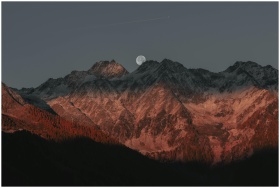 Stunning view of mountain peaks under moonlight with a twilight glow creating a dramatic landscape.