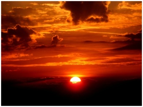 Vivid sunset with a glowing sun on the horizon and dramatic clouds, casting warm tones.