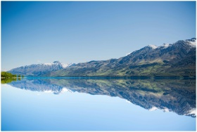 Stunning reflection of mountains on a calm lake under a clear blue sky, showcasing natural beauty.