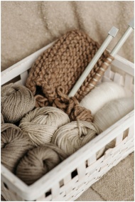 A rustic basket filled with wool yarn and knitting