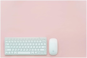 A clean and minimalist flat lay of a white keyboard and mouse on a pastel pink background. Perfect for feminine office themes.
