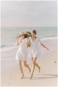 Two women in white dresses running happily along a sunny beach, enjoying summer vibes.