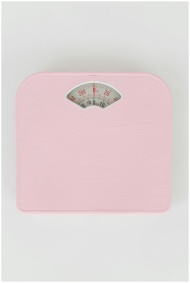 Modern pink bathroom scale on white background, mi
