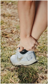 Close-up of a person holding their ankle in a sneaker, indicating pain or injury.