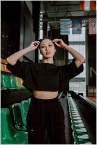 Confident woman in a black outfit poses in an indoor stadium, capturing modern fashion vibes.