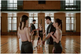 A group of people practicing and training in a gym setting, focusing on teamwork and coordination.