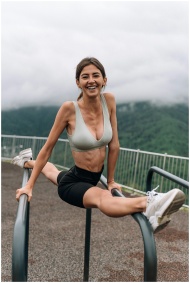 Woman practicing fitness on monkey bars outdoors with a mountain view.