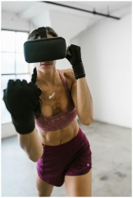 A woman engages in a fitness routine using a VR headset indoors, highlighting modern tech.