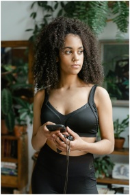 A woman in sportswear holding a jump rope and smartphone indoors, ready for exercise.
