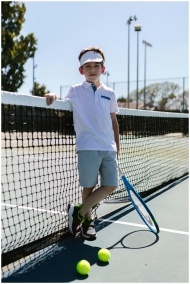A young boy poses with a tennis racket on an outdoor court, wearing tennis attire and smiling.