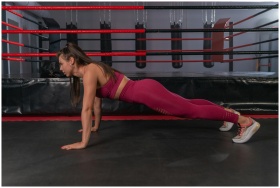 Active woman doing push-ups in a boxing gym, highl