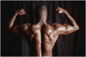Back view of a shirtless man flexing his muscular