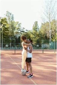 A young couple sharing a romantic kiss on an outdoor basketball court during the day.