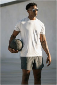Man in orange shorts exercises with a medicine bal