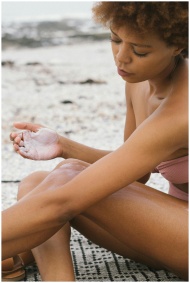 A woman applies sunscreen at the beach, embracing summer skincare and sun protection.