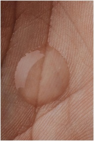 Detailed macro shot showcasing a water droplet on a human palm, highlighting texture and moisture.