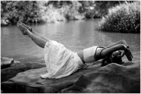 A serene black and white photo of a woman performing a yoga pose by a tranquil river.