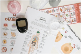 Close-up of diabetes management tools and informational documents on a table.