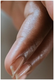 Detailed close-up of a manicured fingernail on smooth dark skin, showcasing natural beauty and care.