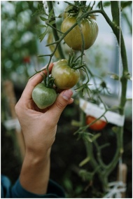 A hand picking tomatoes in a greenhouse, emphasizi