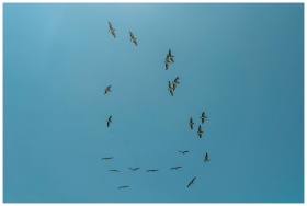 A flock of birds flying gracefully against a clear