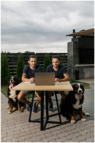 Outdoor scene with twins and dogs during a virtual class.