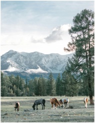 A herd of horses grazing peacefully in a picturesque mountain setting, surrounded by lush trees and snow-capped peaks.
