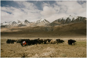 Yaks graze on a pasture with snowcapped mountains in the background.