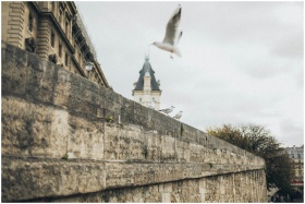 Seagulls flying and perched near a historic stone