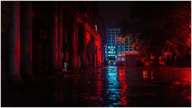 An atmospheric urban street scene at night with neon red and blue reflections and empty pavements.