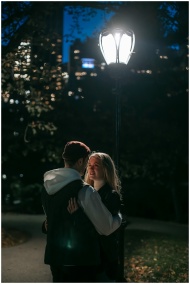 A couple sharing a romantic moment under a streetlamp in a city park at night.