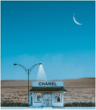 A minimalistic Chanel store illuminated by street lamps under a crescent moon and starry night sky.