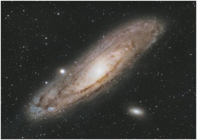Astrophotography of the Andromeda Galaxy (Messier 31) in the star-filled night sky.