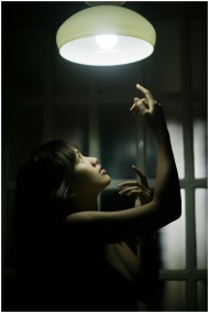 A graceful woman poses indoors, reaching towards an illuminated bulb.