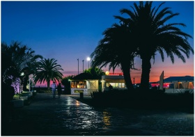 Evening view of a Sochi resort with palm trees, lights, and a vibrant sky.