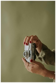 Aesthetic close-up of female hands with red nails holding a vintage camera against a muted background.