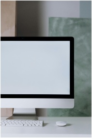 A minimalist workspace featuring an iMac with keyboard and mouse on a desk.