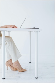 Chic workspace featuring a laptop on a white table with a person in stylish heels and white pants.