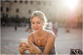 Smiling woman using smartphone outdoors in city square with sunlit backdrop.
